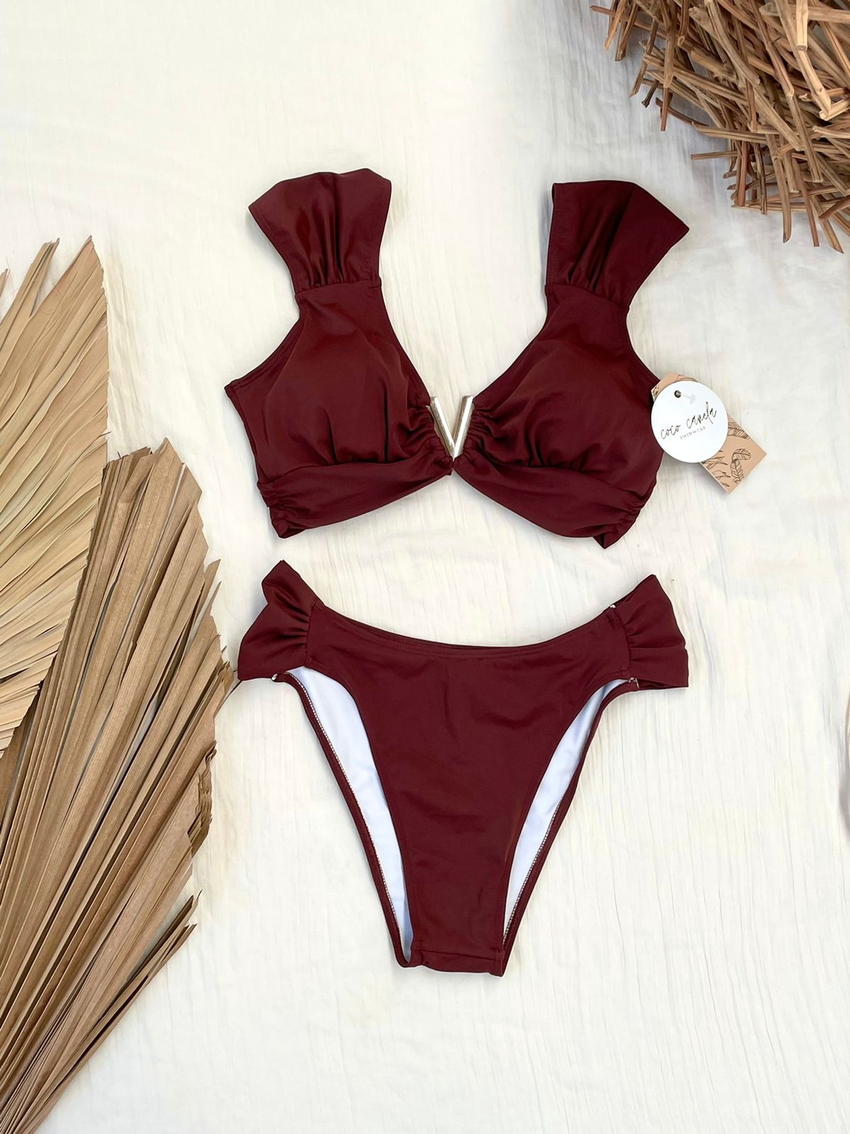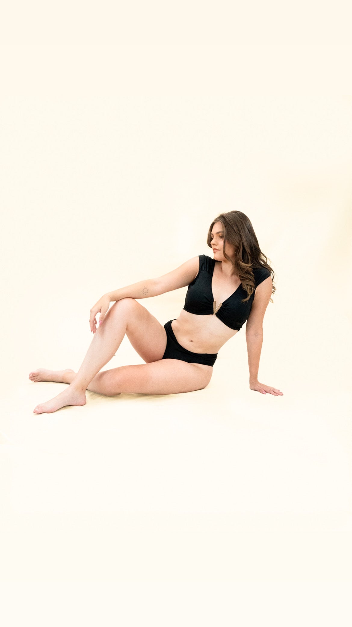 Este conjunto de bikini en color negro de Coco Canela Swimwear es la definición de un estilo moderno y audaz. El top presenta un detalle en forma de “V” que captura la atención al instante, acompañado de mangas cortas que le añaden un toque distintivo y chic. La parte inferior, con su corte elevado, estiliza y realza tu figura de manera sofisticada, ofreciendo un equilibrio perfecto entre comodidad y elegancia.