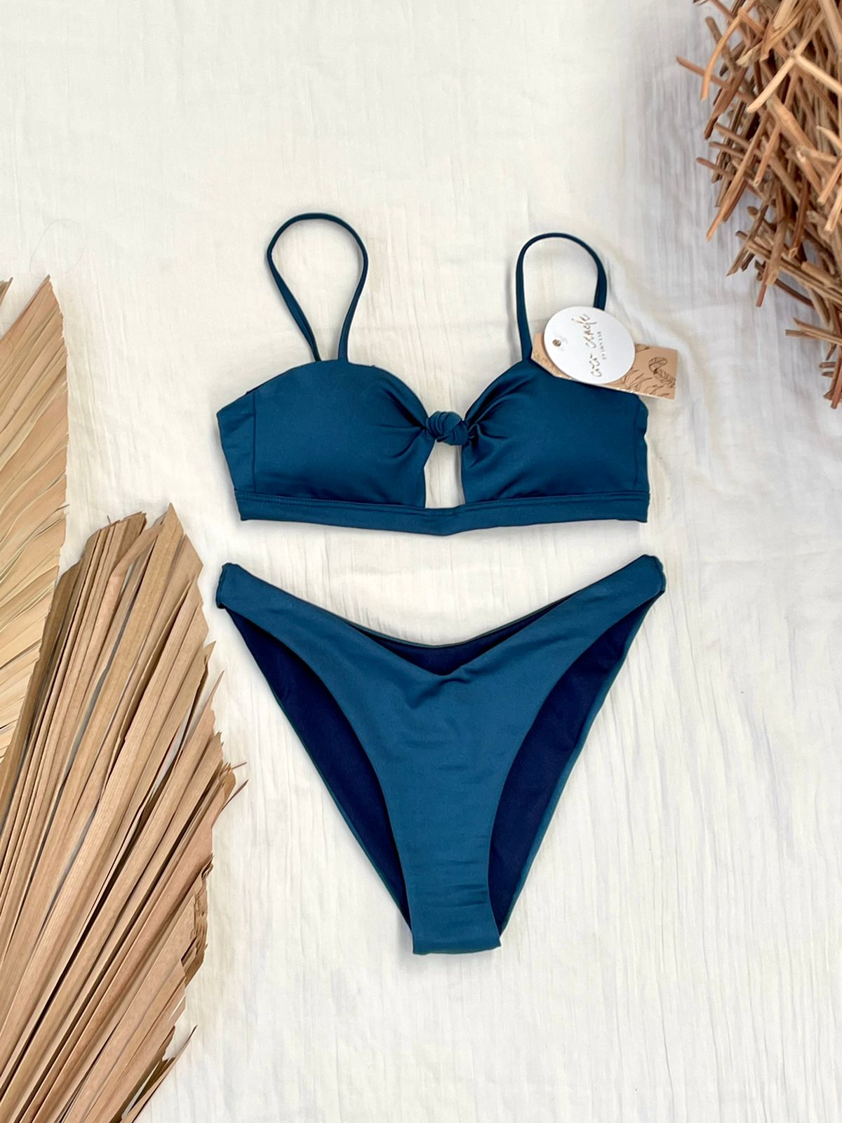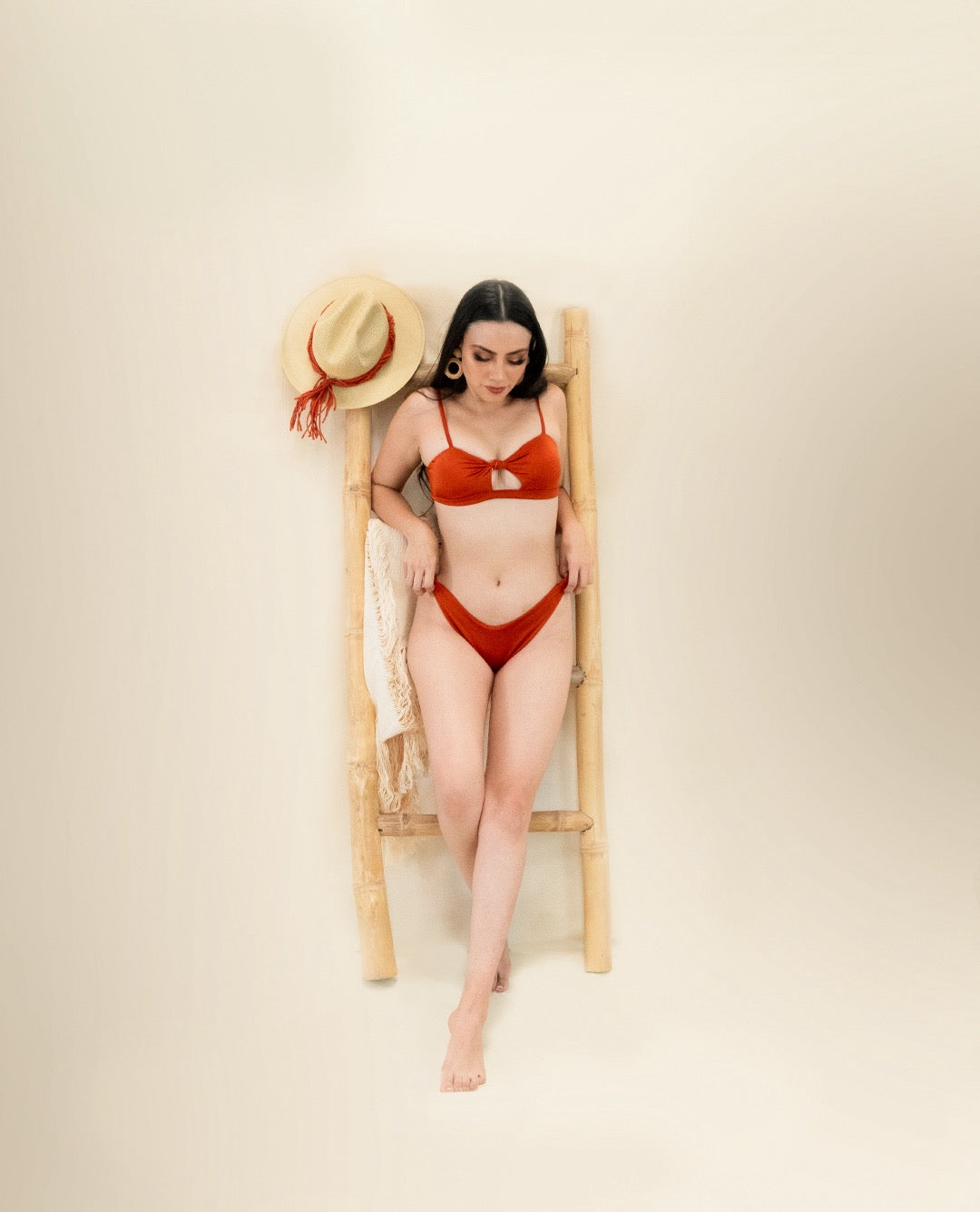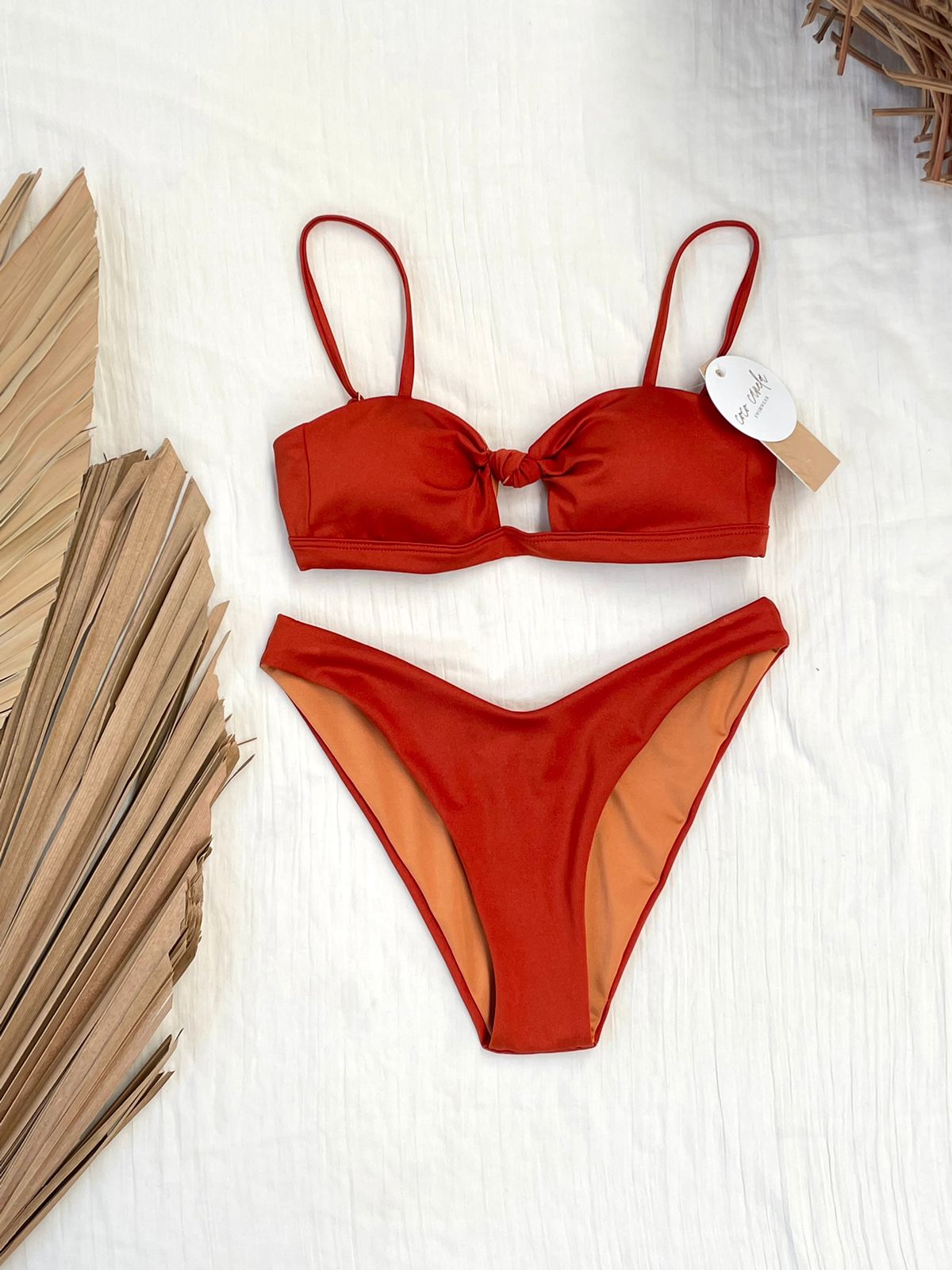 Este bikini rojo vibrante de Coco Canela Swimwear es la elección perfecta debido a que es dos vistas para quienes desean destacar con un estilo atrevido y sofisticado. El top cuenta con tirantes delgados ajustables y un encantador detalle de nudo en el centro, añadiendo un toque de elegancia a tu look veraniego. La parte inferior, con su corte clásico, ofrece una cobertura cómoda y favorecedora, realzando tu figura de manera natural.