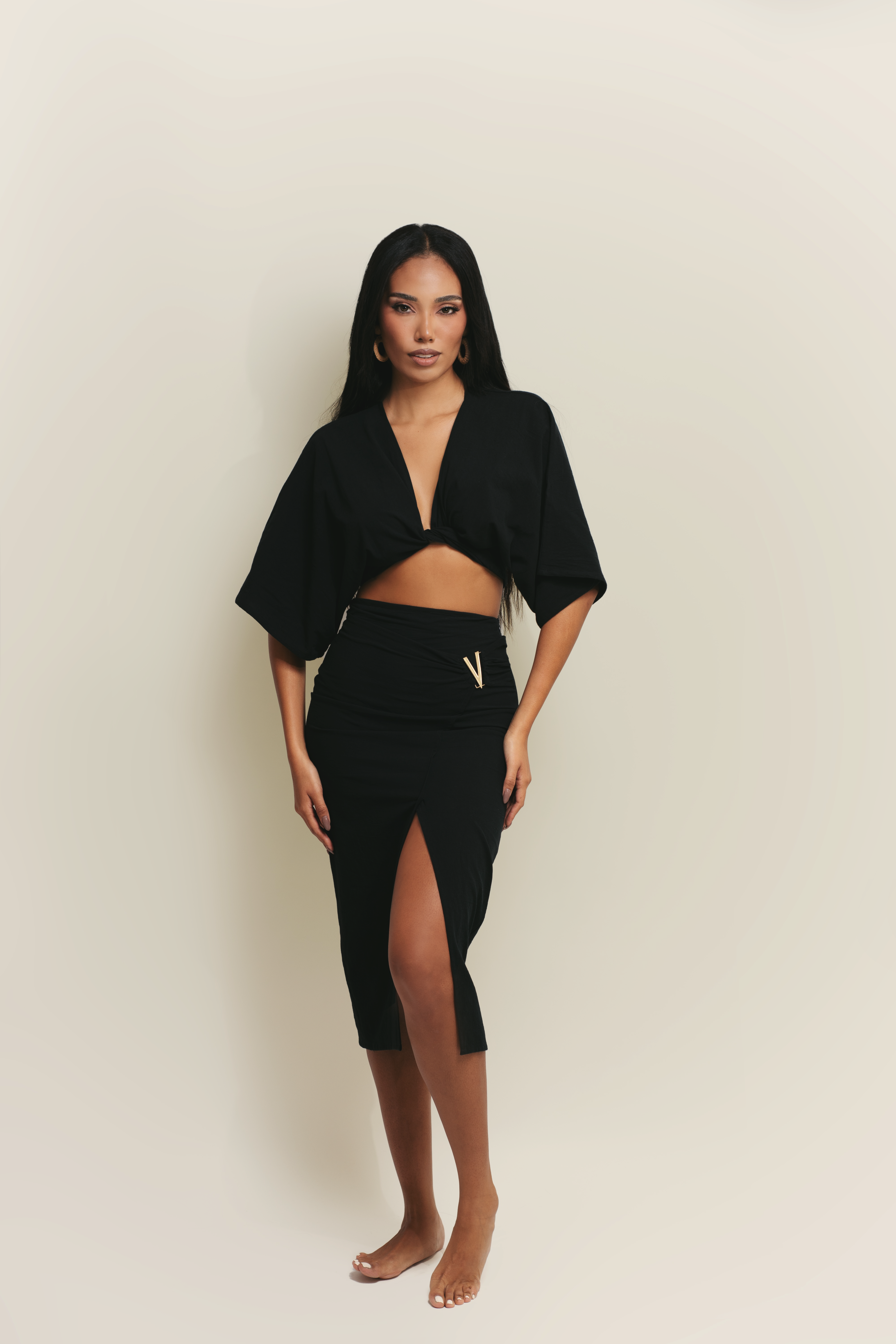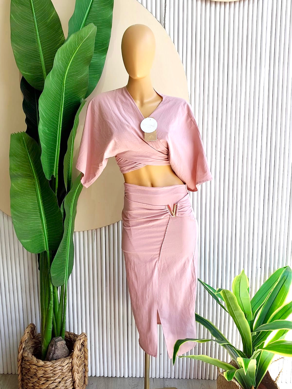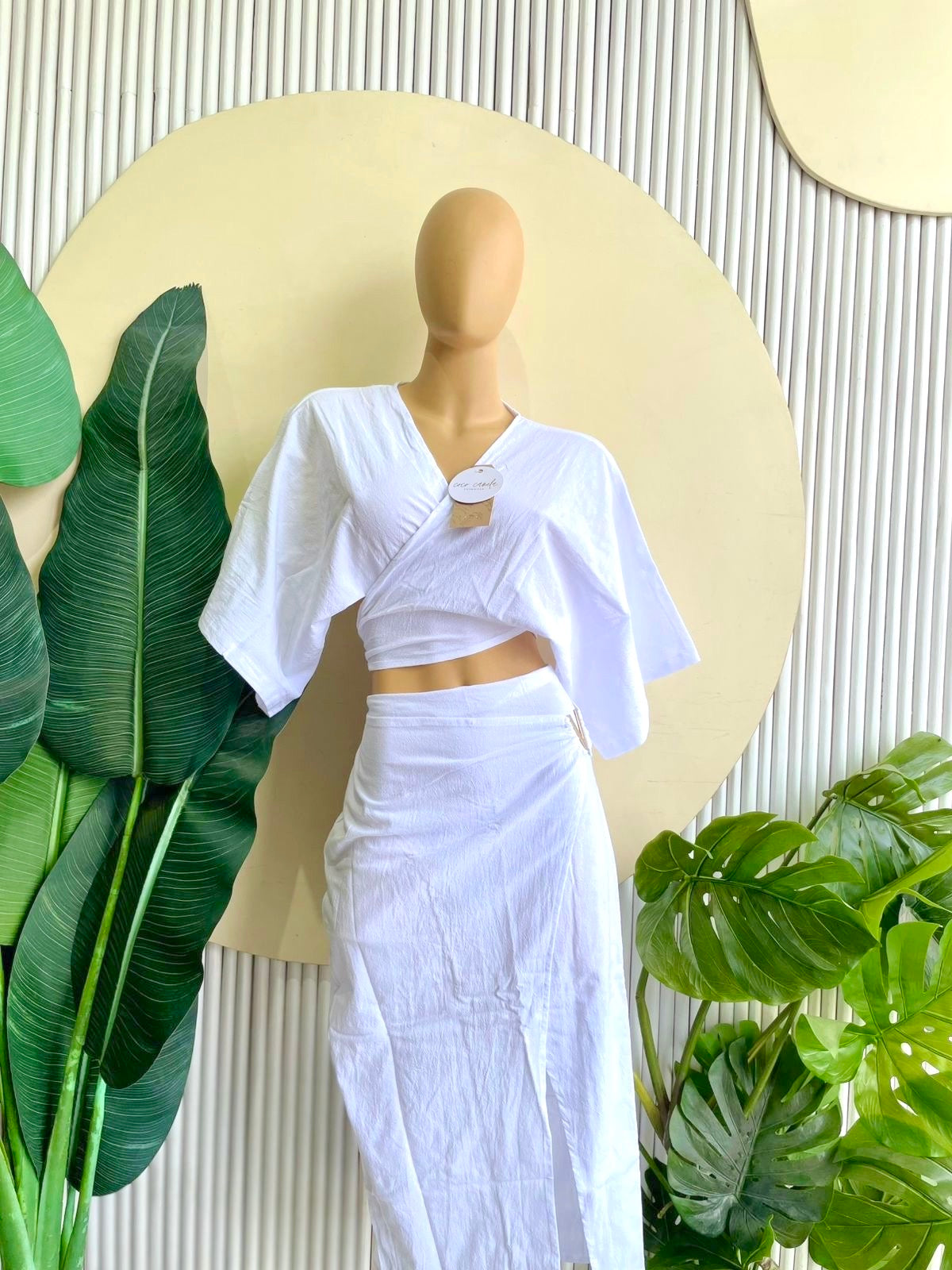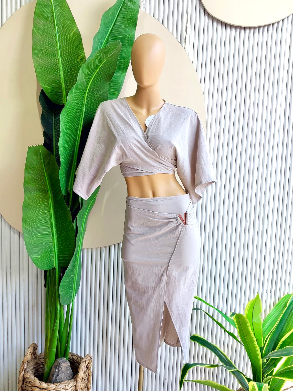 Este conjunto en tono neutro de Coco Canela Swimwear ofrece una fusión de estilo y sofisticación, perfecto para los días de verano. La blusa cruzada de mangas amplias crea una silueta moderna y refinada, mientras que la falda de corte asimétrico con detalle de pliegues añade un toque de elegancia y distinción. Este diseño único resalta la figura de manera sutil, ofreciendo un look que es a la vez cómodo y atractivo.