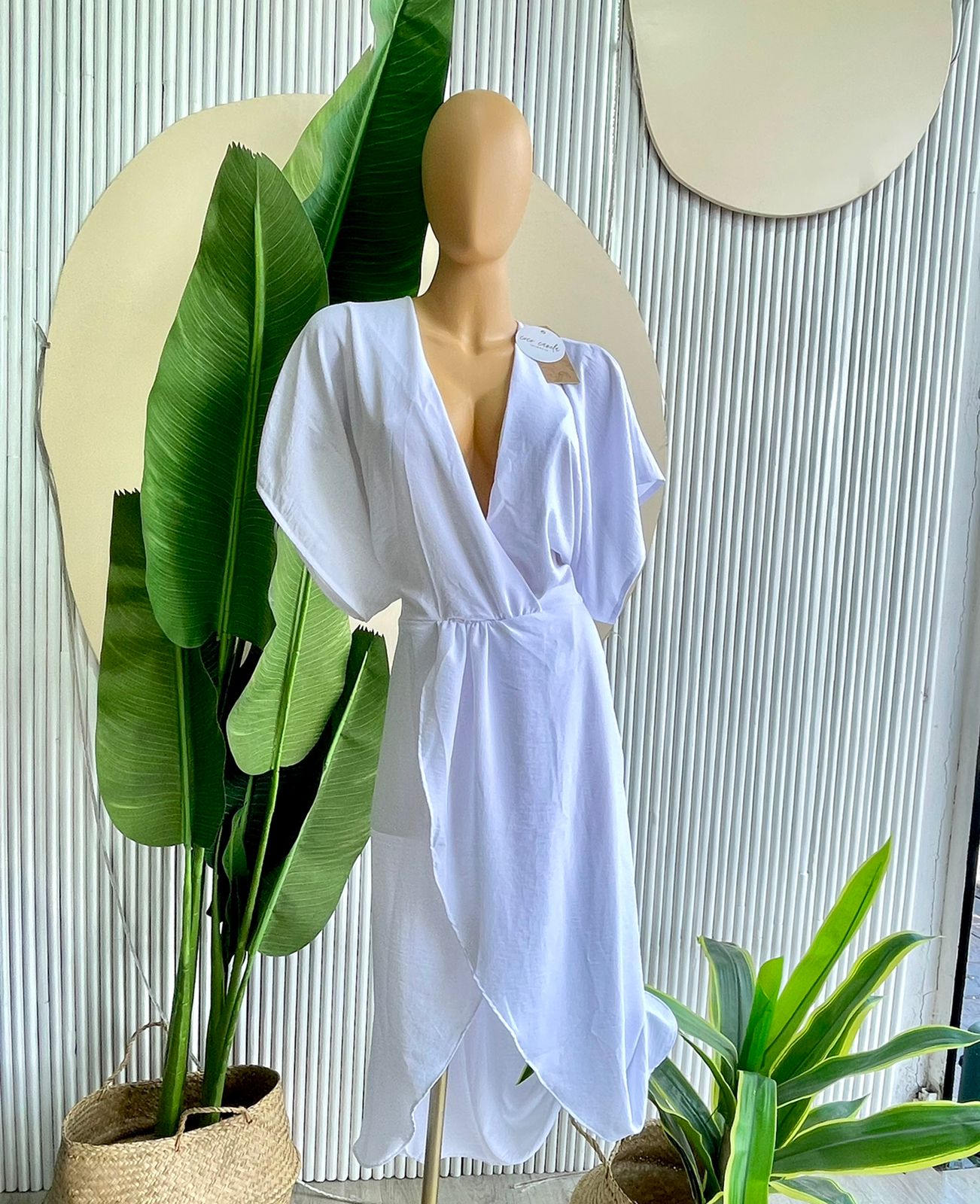 Este vestido blanco de Coco Canela Swimwear es la elección perfecta para quienes buscan un look fresco y elegante en los días soleados. Con un escote pronunciado y un diseño cruzado en la parte delantera, este vestido resalta la silueta de manera sofisticada y fluida. Las mangas amplias y el corte asimétrico añaden un toque de modernidad y movimiento, convirtiéndolo en una pieza versátil que se adapta a diversas ocasiones.