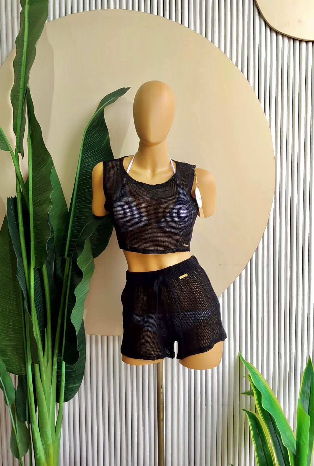Este conjunto negro de Coco Canela Swimwear es la elección perfecta para quienes buscan un look atrevido y moderno en los días de verano. Compuesto por un top y shorts confeccionados en un tejido de malla, este conjunto destaca por su diseño audaz y contemporáneo, ideal para resaltar sobre la playa o en una fiesta junto a la piscina. La malla transpirable ofrece un estilo fresco y ligero, mientras que el corte ajustado asegura un look favorecedor que sigue la silueta de tu cuerpo.